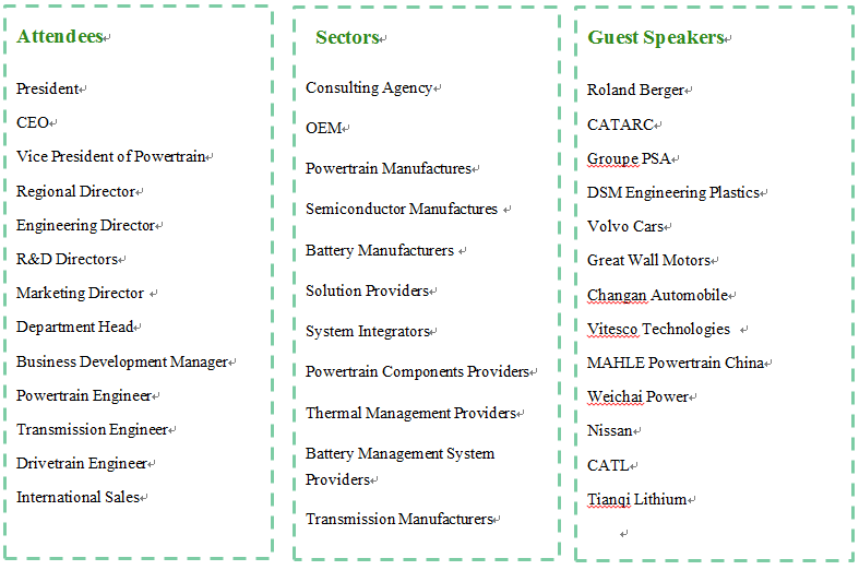 The 3rd China Powertrain Electrification and Innovation Summit will gather about 350+ EV experts and senior executives, they will from world famous OEMs, Tier 1&2 components suppliers, software solution suppliers, automotive battery manufacturers, and etc. Discussed topics will refer to xEV powertrain system design, powertrain control system, solid battery technology and many advanced emerging powertrain technologies. With attending the event, you could have face to face communication with the excellent experts and senior executives in the industry. Moreover, this summit will bring you the current market information and future development trend; help you seize the development opportunities in advance.