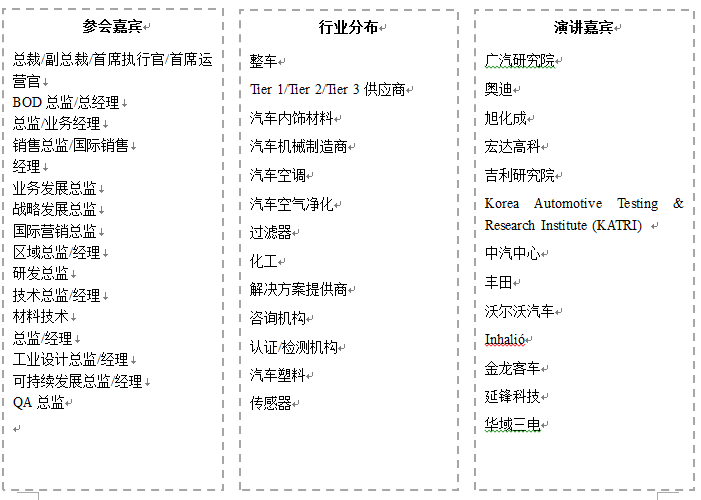 本次第六届中国车内空气质量国际峰会将采用 「线下私享+线上直播」的方式重点讨论车内绿色材料解决方案、车内空气质量检测技术,以及一些改善车内空气质量的先进新技术。本次峰会将聚集约150位车内空气质量管理相关专家领导,旨在为车内空气质量相关业内人士打造一个同行交流的平台,来了解最新行业信息、成功实践以及经验分享。