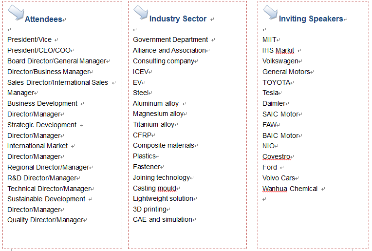 This forum will take place both ONLINE and in-person and set up a main forum on Day One and two sub-forums on Day Two (Metal Materials and Non-Metal Materials). The conference will closely follow the latest industry trends, share innovative light-weighting technologies and valuable practice cases with all participants. Key contents will include automotive lightweight regulations & policies, lightweight materials, structures lightweight design, manufacturing process, and etc. The meeting platform aims to gather outstanding industry insiders from all over the world, exploring the best vehicle lightweight solutions and seeking new corporation opportunities for all attendees. We will work together to build core competiveness of China’s automotive lightweight market, and promote the high-speed and sustainable development of this industry.