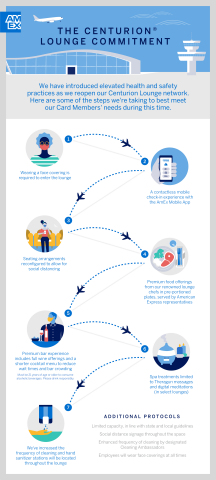 持卡人将体验新的健康安全措施,例如座椅保持社交距离,减少接待量,增加清洁频率,进入贵宾厅时要求佩戴口罩,用上餐代替自助餐等等。如需体验非接触式值机,持卡人可下载American Express® App,使用移动值机功能。这些措施将持续接受重新评估,考虑持卡人的需求以及州和当地政府和卫生主管部门的要求。请点击这里了解更多信息:thecenturionlounge.com/reopening。