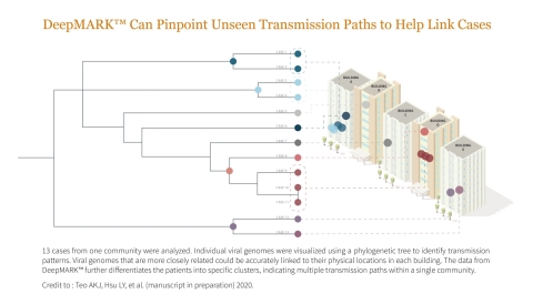 DeepMARK™通过分析sgRNA准确定位无关联病例和病毒簇来源,支持社区快速追踪社内病毒感染。使用高质量的基因指纹识别技术,鉴别病毒传播路径、病毒簇和病毒传染性,以便公共卫生中心快速应对疫情爆发。同时可以检测无症状患者和康复患者是否具有传染性。