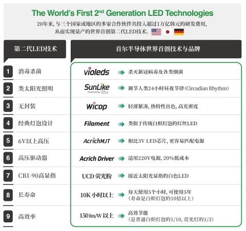 首尔半导体是一家专业LED制造商,全球LED行业第四。拥有超过14,000项专利,从IT到照明领域,竭诚为客户提供全线高品质LED产品。自主创新技术包括模拟自然光谱的SunLike 技术,无封装LED(WICOP)、研发并成功量产的交流和直流均可驱动的“Acrich”、获得专利的高压LED“MJT多结芯片技术”、以及比传统LED亮10倍的“nPola”和UV杀菌技术”violeds”。目前,首尔半导体在美国、欧洲、日本及中国设立了4家法人,在全球设有50多个海外销售办事处以及150家代理商。作为全球LED供应商,首尔半导体还一直致力于各种各样的人才培养和发展活动,诸如CSR活动、奖学金项目、产学合作项目和教育规划等项目来吸引人才和回馈社会。