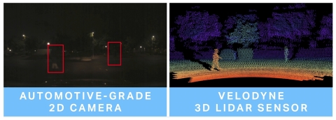 汽车摄像头和Velodyne的Velarray激光雷达在路灯和近光头灯的昏暗条件下所产生的图像并排比较。(图示:Velodyne Lidar, Inc.)