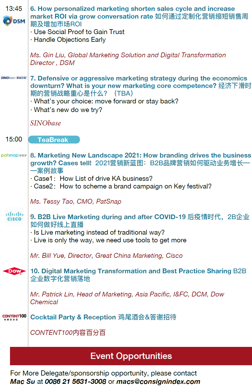 - 70+位演讲嘉宾确定!95%以上的嘉宾来自甲方企业总监级别。跨越50个B2B垂直行业,360度无死角了解B2B全行业营销发展趋势!
