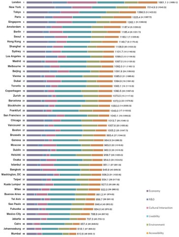 自2008年以来,GPCI年度报告根据城市的“吸引力”或吸引世界各地有创造力的个人和企业的总体能力,对40多个主要城市进行了排名。对这些城市的评分基于六大功能70个指标,包括经济、研发、文化互动、宜居性、环境和可达性。为了反映影响全球城市的条件变化,GPCI不断微调其指标和数据收集方法。