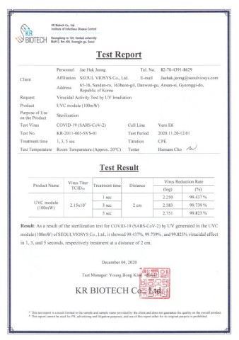 KR Biotech对首尔伟傲世的UV LED Violeds的测试报告和结果(照片:美国商业资讯)