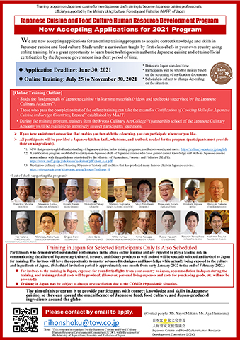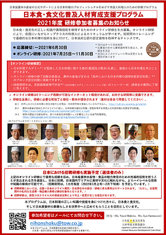 我们现在开始接受线上培训项目的报名,该项目旨在让人们获取有关日料文化的正确知识和技能。人们可在所在国通过线上培训,学习由一流大厨教授的课程。这是一个在短时间内学习地道日本料理制作基本技巧并获得日本政府官方认证的绝佳机会。