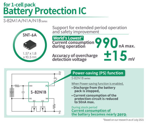 ABLIC's 1-cell Battery Protection ICs with the World's Lowest Current Consumption During Operation with Power-Saving Function (Graphic: Business Wire)