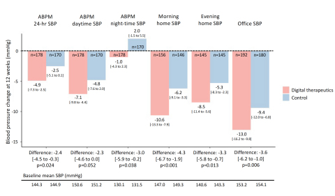 主要评估项目即研究进入点12周时基于ABPM*3的24小时收缩压组间差值(校正均值)为-2.4 mmHg,表明与对照组相比,使用治疗app的干预组有显著降压效应(图1)。