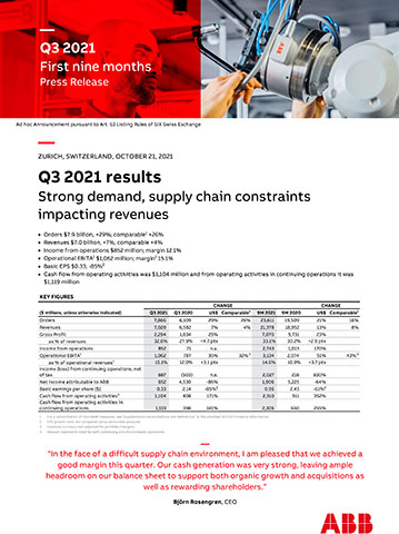 Revenues were hampered by supply chain constraints delaying customer deliveries. This was primarily related to semiconductors and imbalances in the overall supply chain, with the impact most tangible in Electrification and Robotics & Discrete Automation. Revenues increased by 7% (4% comparable).